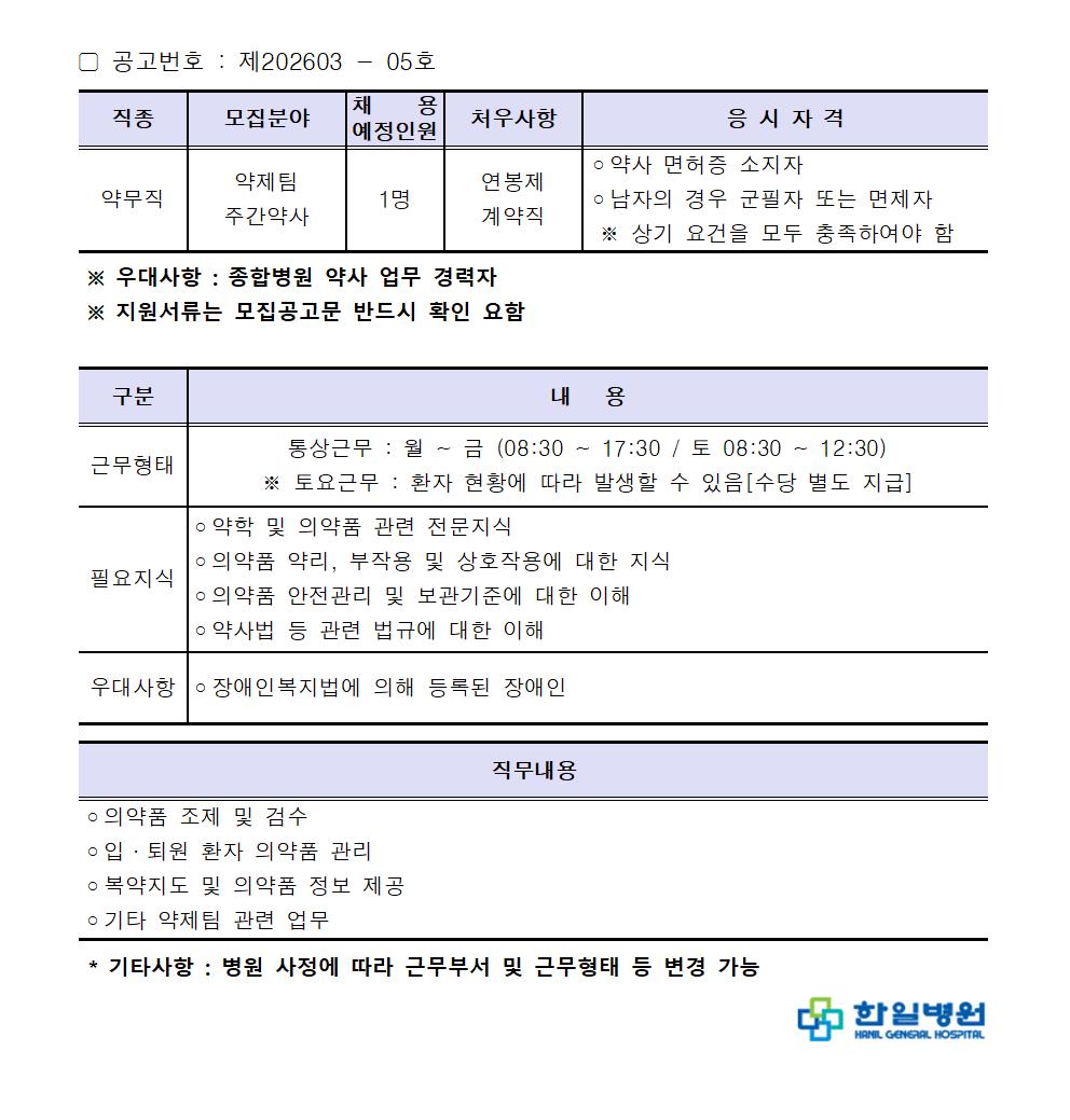 5. 접수방법 : 반드시 인사담당자 e-mail 접수(insa@hanilmed.net)
